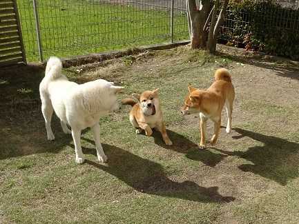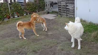 我が家で過ごしていた頃と同様に結母ちゃんとのプロレスごっこで庭遊びを始めたリッキー。