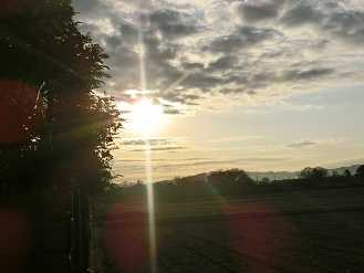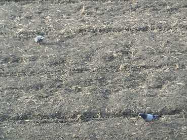 朝日が注ぎ始めた庭の前の畑では朝食を取るハト達の姿が見えます。