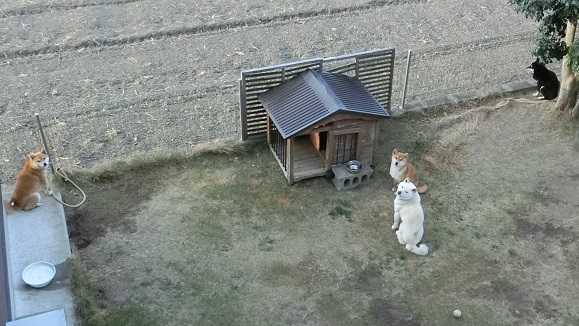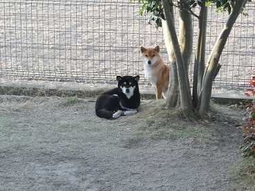 ナナの散歩を終えて帰宅すると、ロードワークを先に終えたマリと結がお決まりの庭木の
