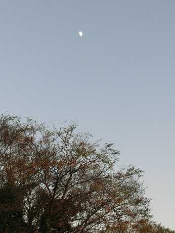 上弦の月が浮かぶ様子を眺めながら、森の入口へとやって来ます。