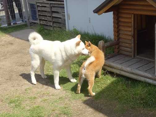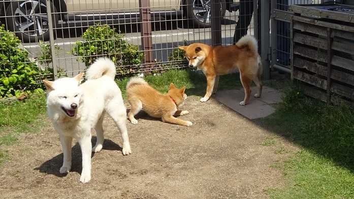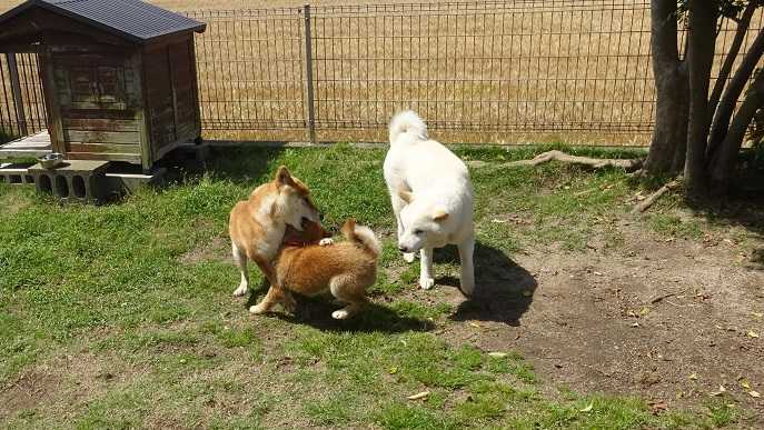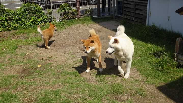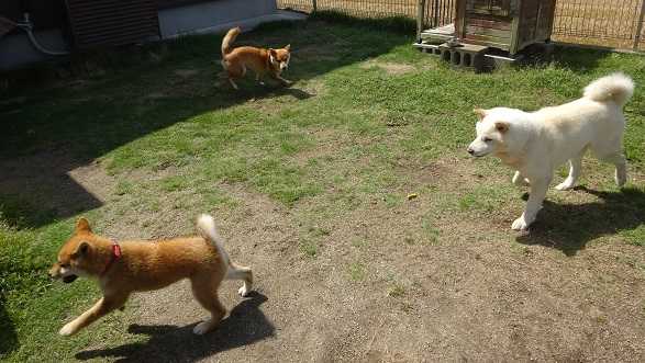 言わんばかりに軽く鼻に皺を寄せながら年長犬達に勝負を挑む坊の姿を眺めながら、こちら