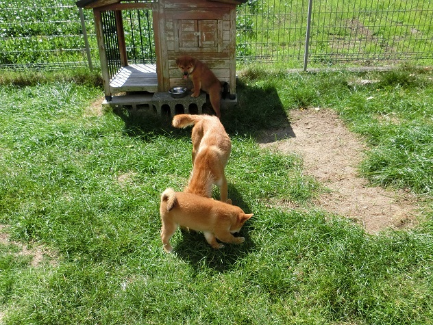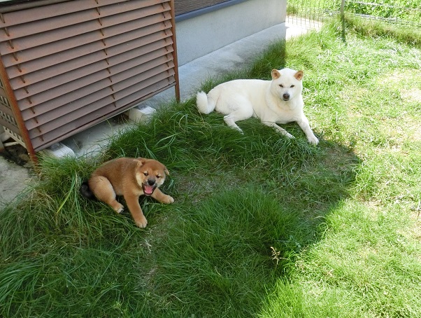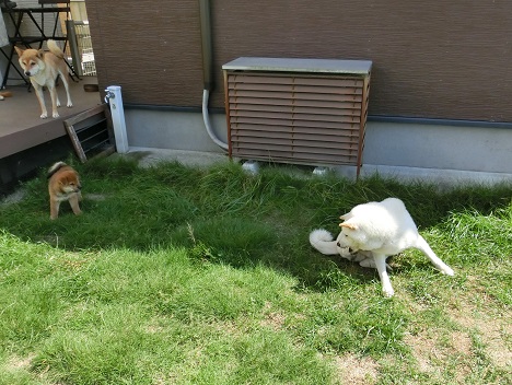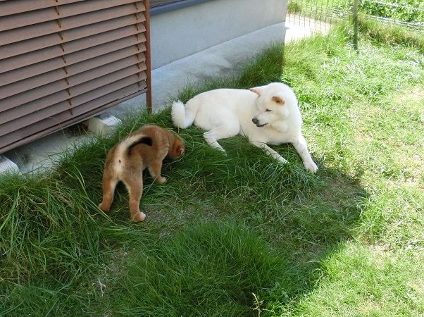 プチ散歩を終え、思い思いの場所で再び庭番を務めながら寛ぎ始めた面々のもとへこの日もハル親子が庭遊びにやって来ます。