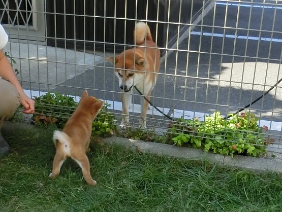 そしてこちらはフェンス越しに庭遊びにやって来たハル親子を見守っていたカイ爺のもとへやって来たちび子。