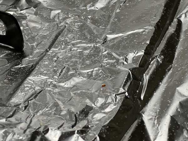 下の2枚の画像のようにアルミホイルが跳ねだらけになりました。フローリングに敷いた新聞紙にも相当跳んでいましたよ