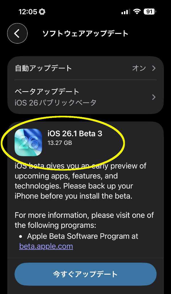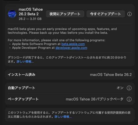 日本時間の2025年10月13日にAppleInsiderに出た、マルコム・オーウェンさんの記事を参照しました。元記事は開発者向けにBeta 3が出たよというものでしたが、予想通りPublic版が出てきたので、色々とインストール中です。Beta 2はちょうど一週間前に出てきました。1.iOS 26.1ベータ3:ビルド23B5064e2.iPadOS 26.1ベータ3:ビルド23B5064e3.watchOS 26.1 beta 3:ビルド23S5022e4.macOS Tahoe 26.1 beta 3:ビルド25B5062e5.visionOS 26 26.1 beta 3:ビルド23N5033dで6.tvOS 26 26.1 ベータ 3 :ビルド 23J5563d中略AppleInsider と Apple は、テスト用オペレーティングシステムやベータ版ソフトウェアを、必須または「ミッションクリティカル」のハードウェアにインストールしないことを強く推奨します。データが失われるリスクが常にあるため、ベータ版の参加者は、セカンダリまたは必須ではないハードウェアを使用し、重要なデータを常に十分にバックアップする必要があります。Appleはまた、開発者バージョンの直後にパブリックベータビルドを導入します。リスクが軽減されるため、非開発者はそのビルドを待つことをお勧めします。私はPublic版ユーザーですが、不具合をフィードバックするときは”不具合の再現性”も重要ですね。シンプルに箇条書きで伝えています。