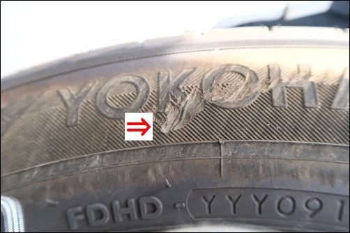 あとで、よく見るとタイヤの横面もかすっていた。タイヤの横面が傷ついていたら、高速で走るときなどに影響が出る。最悪だとバーストの危険もあるかも知れない。