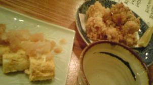 画像は、だし巻き玉子、あんこうの唐揚げ、芋焼酎のぬるま湯割り。