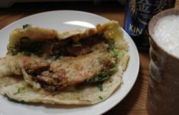 お好み焼きの様なモノで、牛すじとネギが入っています。