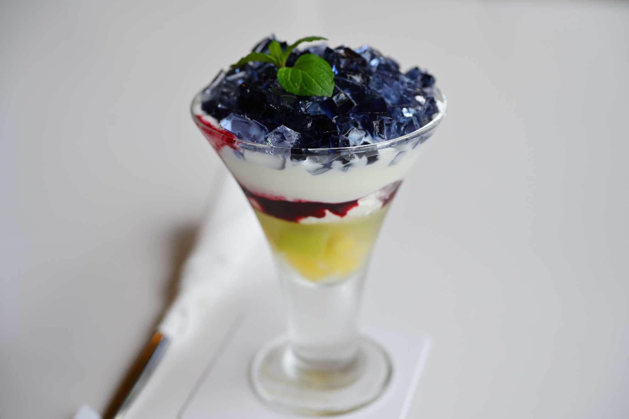 ブルーベリーのソース、果実、ゼリーなどであじさいを表現。