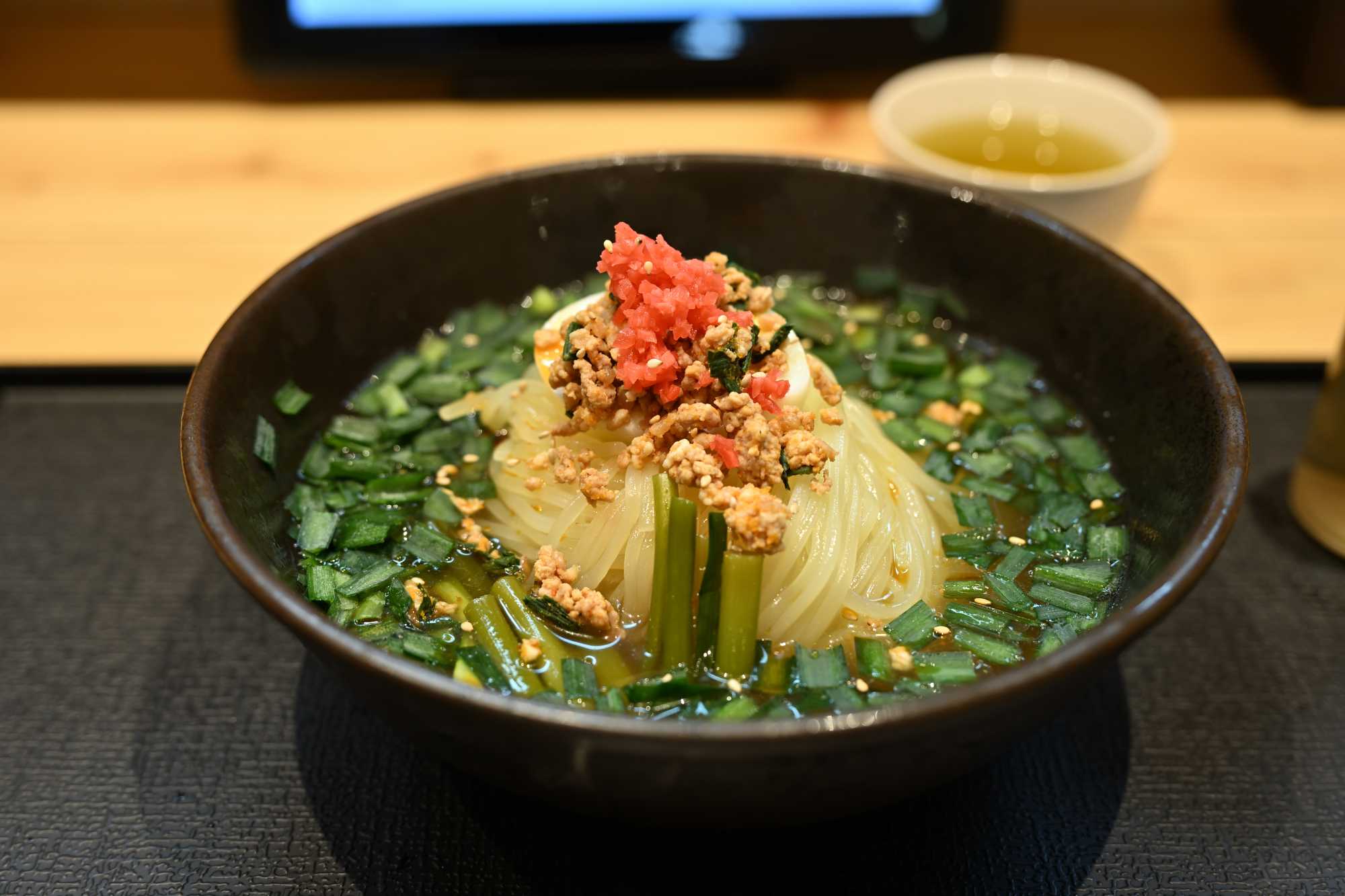 ニラやにんにくの芽、挽肉、紅生姜がトッピング。