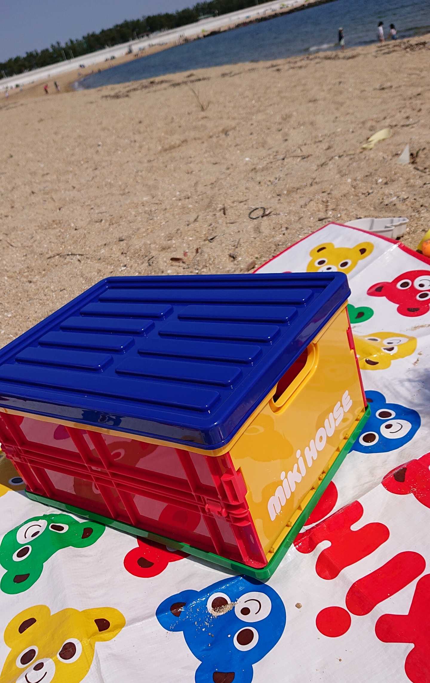 ほんでもって、フェアのコンテナをどうしてもオシャレピクニック風に持って行きたかった私は、ミキハウスのレジャーシートと共に海岸に広げられたので満足です(笑)🤣