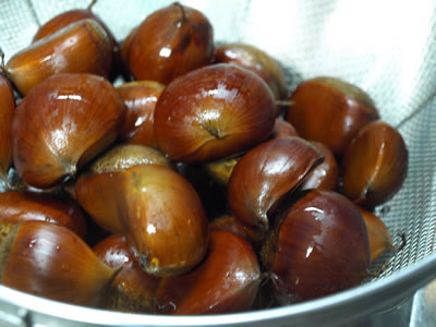 起きたら、昼でした・・・。何もしてないつもりでも、体は意外に疲れているものでして、20代だったら、徹夜で遊んでも仕事にも行けたけど、今、徹夜とかぜったい、無理。 つーか、夜12時以降がもう無理。もうきっぱり断言。昨日の内子町並み散策で歩いたせいか、屋台船に乗り降りする時の足のふんばりのせいか、ブドウ狩りで何度もしゃがんだりしたせいか、全身筋肉痛なんですけど、・・・ナゼでしょう?「老化」というキーワードが頭をかすめます。怖いですね。さて、そんなケダルイ一日。久々に、パンを焼きました。我が家でも栗がとれはじめ、毎年恒例の栗だらけの日々が始まりました。今日は、 栗を使ったパンを焼いてみようと。栗入りのパンレシピとしては、栗あんにしたり、甘く煮たものを入れたりと、色々と方法はあるんでしょうけれど、めんどくさいので、皮を剥いてレンジでチン。ただのゆで栗を食パン生地に投入。ちなみにこんなの本にも載ってないし作ったこともない。しかも、まだあるハズと思っていた強力粉がなかったので、フランスパン用準強力粉と、うどん用中力粉をブレンドするという、ホントにテキトーなパン作り。“うどん用”には、さすがに引っかかったけど。まあ、売るわけじゃないしね。(いつもこの言い訳)自分で食べるだけだしね。いいんですよ、これで。 それなりに食べられるもの。 Posted by 曽我
