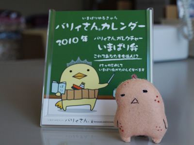 台風、近づいています。皆様十分にお気をつけ下さいね・・・。台風とともに(?)今日、松山第一印刷から新入社員の方が3人研修に来られていたようです。メイドインしまなみの事務所にも少しだけ見学に来られました。その中の男子の一人に 「 ブログ、書かれてますよね? 」と唐突に切り出され、またもやマジでびっくりしました(--;)しょうもないことばっかり書いてスイマセン、ほんっとスイマセンという感じです。こうやって名前も顔も職場も公表しているので知り合いが見れば「曽我だ!」と気づくでしょうが、まったく知らない人が自分のことを知っていることにはやはりいつまで経っても慣れません・・・。会ってみたら意外と普通の人なので驚いたという方もいらしゃいました。そうです。私は普通の人です。そんな話はさておき。楽しみにしてくれている方も若干名おられると思いますので、バリィさん情報をふたつばかり。 今治といえば、やっぱりタオルじゃろがね!! ってことで、ミニタオルハンカチ販売開始しました。柄は2種類です。プリントです。ジャカード織りじゃないです。(・・・それは無理か)ミニハンカチサイズです。20×20cmです。1枚500円です。はい ご注文はコチラから~~それから、もひとつ。お知らせですが、 実は、来年のカレンダーができてます!!バリィさんカレンダー、略して バリカレ!!今日、田中部長、御大自ら最後の袋詰めと検品をしている姿をこの目で見ました。卓上カレンダーのようです。準備ができましたらバリィさんカレンダーのネット販売も開始しますので、そのときはぜひよろしくお願いします!今治市民は一家に一つはお求め下さい。中味見ましたけれど、かなりかわいいですよ。シンプルで、よいです。バリイさんの今治弁レクチャーカレンダーになってまして、 例えば、1月は 「いってこーわい」あ、一応、標準語での翻訳も付いています。今治在住の皆様はもちろん、全国津々浦々、今治出身の皆様、海外にいらっしゃる今治出身の角田様(←私の友達)来年はバリィさんカレンダーで楽しい一年を過ごしましょう!というわけで、販売開始の際にはご案内しますのでよろしくお願いします。 Posted by 曽我