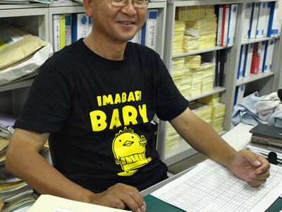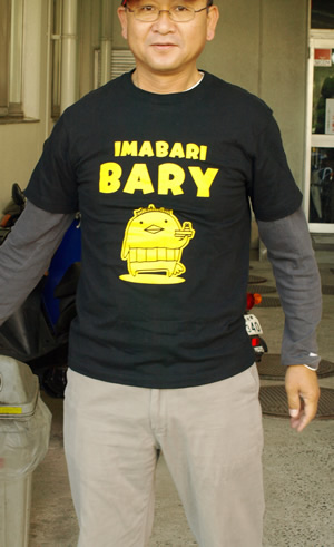 今日から、「しまなみ海道スリーデーマーチ」がスタートしています。あいにくの雨午後からはどしゃぶりで・・・せっかくの素晴らしい景色を100%楽しんでいただくことができなかったのが、ちょっと残念です。仕事で大島へ行っていた磯野テンチョも大島縦断中のものすごい数の人を見たと驚いていました。皆様雨の中お疲れ様でした。明日からは晴れるといいなぁ~。さて、このスリーデーマーチの3日間、メイン会場の今治城吹揚公園で、バリィさんグッズを販売しながらバリィさんPRのためのティッシュ配りをやっている第一印刷のスタッフの皆さんも、夕方会社に戻ってきていました。・・・雨の中お疲れ様でした。森さん、 バリィさんTシャツ!! 略してバリT。黒に蛍光チックな黄色。激しく目立ちます・・・。いや、まあ。バリィさんを知っていただくためにはこのくらい目立たないと。 バックプリントも。哀愁漂うバリィさん&森さんの背中。これを着て吹揚公園でティッシュを配っている怪しげな人たちを見かけたら、ぜひ声をかけてあげて下さいね!バリT、私も欲しいなぁ。・・・ってどこに着ていく気や?って話ですけど。あ、それと。申し訳ありません、お詫びと訂正があります。先日のスタッフ日記の中で、10月10日・11日 「タオルフェア」でもバリィさんグッズ販売をします、と書いたのですが、(×)タオルフェア(〇)今治せんいまつり2009です。ゴメンナサイ。 今治せんいまつり2009 日時:10月10日(土)・11日(日)10時~17時 場所:今治地場産業振興センタータオルをはじめ各自の地場産品の販売やラテンバンドのステージもあったり親子でたのしめるタオル人形教室やお楽しみ抽選会なんかもあるみたいです。かなり楽しそうですよ。お出かけの際には、ぜひバリィさんグッズもチェックしてみてくださいね。激しく目立つバリTスタッフもおりますので(^^;) Posted by 曽我