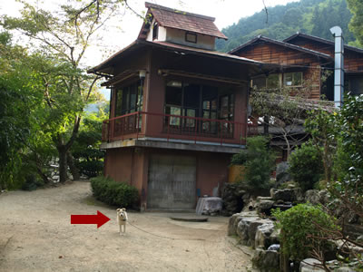 せせらぎ亭さん、番外編。駐車場に車をとめ、門をくぐり、きれいに手入れされたお庭を楽しみながらお店の入口まで歩いていると、 ・・・なんかいますけど?白いの。番犬?てゆーか、なぜここに飼い犬?近づいてみました。 かっ・・・かわいい~っ昔うちで飼っていた犬によく似ている・・・。思わず 「シロ・・・!」と呼んでみる。 無視かよ。気を取り直して、すこし進むと、池と水車があり、その脇に、水車小屋?の中になぜか、 いのしし のはく製!?こわすぎ。めっちゃ、にらんどるやーーん(泣)びくびくしながら、お店の入口まで歩く。キジとか飛んできたらどうしよう。で、お店の入口で、さらにショッキングゥ~なものと遭遇。 いのしし、吊るされとるやないかーい!しかも、中には、タヌキが逆立ち????(違うかも。怖くて正視できず)かなりワイルド!! 合掌。 Posted by 曽我