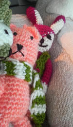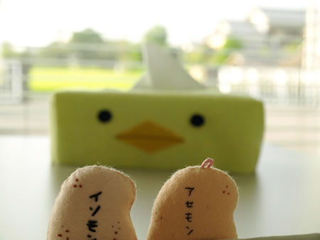 私の友達も衝撃を受けていた、二人の母が起こしたミラクル。密かに続きがあります。実は、今日の夕方、純ちゃんがヤツを連れてやって来た。 背後注意。 そう。まさかの。 再会!!! 並べてみると、まったく同じ。向かって右のがうちの母がこないだ買ってきたもの。純ちゃん家のは、長い間、そのへんで放置されていたらしく見事に色あせています。しかしこれを見れば、出どころが一緒だということが100%証明されましたな。フフン。もし同じ人が作ったのでなければ、このナゾのキャラクターが、南予地方あたりで大流行しているということでしょう。頭のでかさは一緒だけど、胴体と足の長さがかなり違うことが気になります。足を編んでる最中にめんどくさくなったか・・・。ついでに、純ちゃんは他の仲間も連れてきてくれました。オールキャスト勢ぞろい。 すっごい、バラバラ。 この統一感のなさ。 すばらしい!!私の予想では、これを作った人は、緑色の毛糸を使い切りたかったのだと思う。 Posted by 曽我