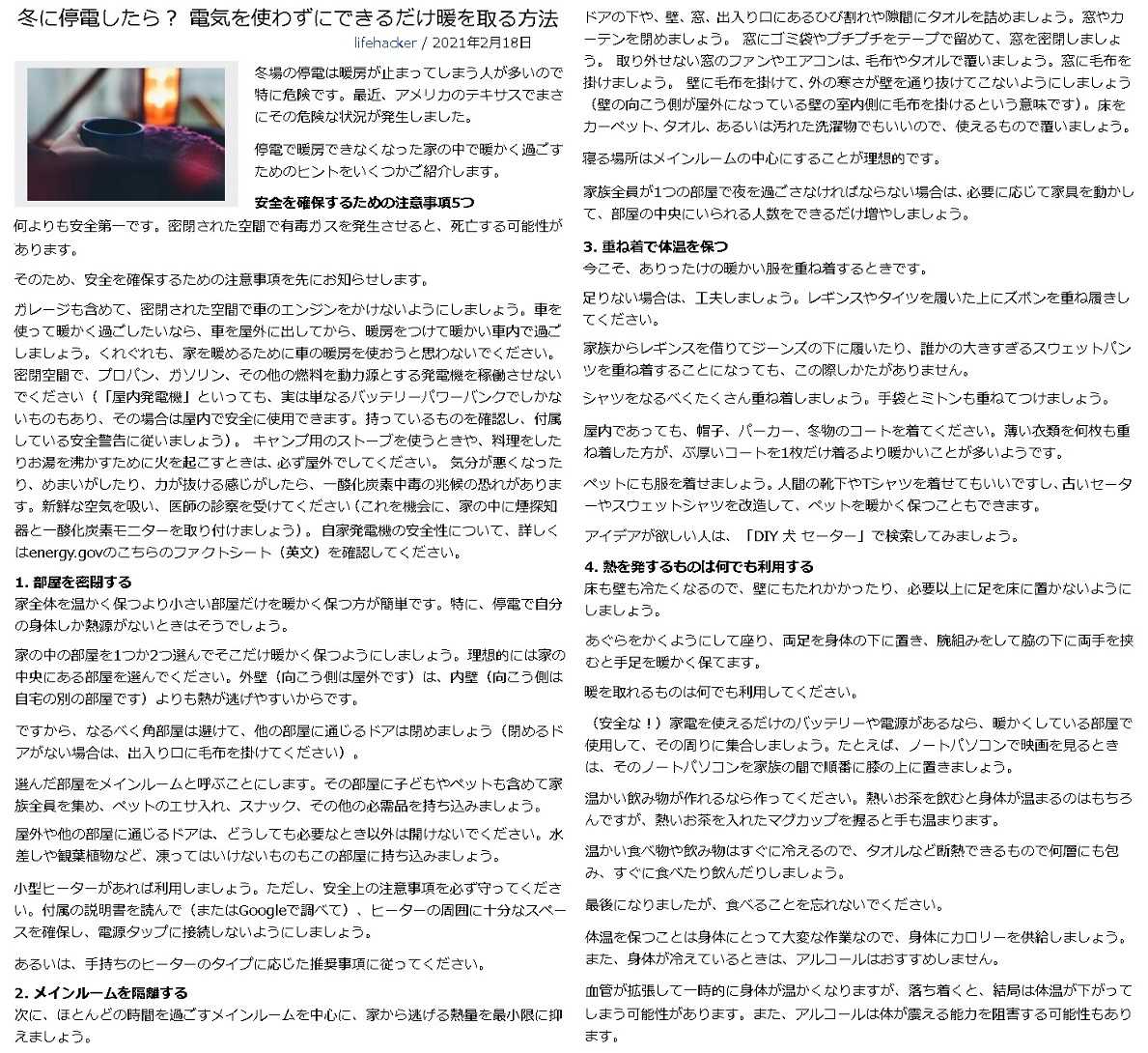 このご時世、何が起こるかわかりません。ー20度の厳寒時に大停電に見舞われたら…。上の記事では、どれほどの寒さを想定して書かれたのかが不明ですし、それへの言及はありません。北海道でもスーパー地震の発生が予想されていますし、それが厳冬期であるかもしれないのです。このような時に、電気が絶たれてしまったら、暖をどのようにして保てばいいのでしょうか? 上の記事に、そのヒントが書かれています。いわく、部屋を密閉し、メインルームを隔離し、重ね着で体温を保ち、熱を発するものは何でも利用し、身体にカロリーを補給すると列挙されています。なるほどと思いますが、こちらの極寒の気候条件には刃が立たないのではないでしょうか? 部屋全体が氷点下に突入してしまったら、もはや手が付けられないでしょう…。氷の女王の宮殿のように…。あれほど立派な部屋ではとてもないのですが…。ポータブルな石油ストーブは助けになるかも…。排ガスが危険ですので、定期的に空気の入れ替えが避けられませんが…。プロパンガスコンロでの湯沸かしも同様に…。それでも部屋を暖めるほどの熱量には容量不足でしょう。妙案はないですね。公的な避難所へ移動する以外には助からないかも…。そこでも断電しているのですが…。わが家では、いざカマクラに備えて、HV車から1.5kwhの電力を供給せしめる非常電源装置を備えております。これを稼働させれば、石油利用型集中暖房とペレットストーブの2つの暖房機器が同時に使えるのです。寒さを弾き飛ばすに足る発熱量は十分に備わっております。よっぽどのことがない限り、最悪の事態は免られそうです。ガソリンさえ補給し続ければ何日でも…。そんな最悪の日が訪れることのなきように、ひたすら祈りたいですが…。