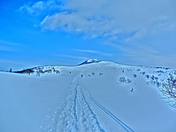 藻琴山の山頂の真下を回り込んで、美幌峠へ向けた、山下りが始まった。低木の林の中を、足下を気にしながら、下っていくのも、それなりに柔ではない。あたり一面が見通せる地点で、振り返り、藻琴山山頂を写した。モンブランのようだとの声も聞こえた。
