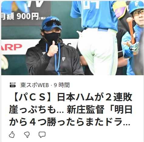 日ハムが、CSでの対SB戦で、連敗を喫しております。上の絵のように、新庄は、強気ですが、3連敗し、CS敗退の公算が濃厚です。そもそも、対SB戦は、灰色が濃かったのですから、ここにきて、その趨勢を一気にくつがえすなどの見通しは、立たぬでしょう。紙面では、この監督のチーム強化構想が、もてはやされてきておりますが、どうも感心しませんですね。その日のできの良い選手を打順にかかわりなく、使っていく…。それは、一見すると、このチームの現状にぴったり合致したやりかたのように見えるのですが、果たしてどうでしょうか❓チームの看板打者がだれなのか❓ いるようで、いないのです。中軸に座った打者が、打てれば、大拍手なのですが、それほど甘くはないでしょう。とりわけ、大試合の場合に、それが、表面化するのです。また来年も、新庄が監督続投の予想が出ておりますが、それでは、希望が持てませんですね。ヒトがいないのかな~❓