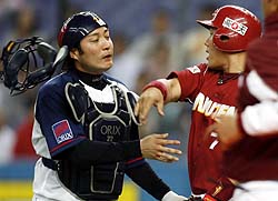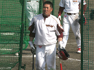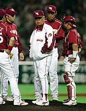 2007年・ペナントレース「K O」関西シリーズの2戦目が終了しました単独トップ#7_山崎 武司 内野手ここまで3本のホームランを放っています野村監督も「山崎様々」最敬礼です今シーズンのチームは「若手」と「ベテラン」の融合が進んでいます『負けたくない』若手から刺激を受けているようです最終回には死 球を受け揉み合いになりました闘志を剥き出しにした『主砲の威厳』を示し「若手」を引っ張ります『どすこい山崎』がんばれ東北楽天ゴールデンイーグルス
