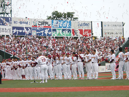 交流戦が始まっています ここまで上位をキープしています 勝率も5割をいったりきたりと夢の貯金生活目前です オールスターファン投票の中間発表がありました 山崎武司選手が両リーグ最多の7万票超えで指名打者部門1位を獲得しています 田中将大投手も先発で1位を獲得 福盛和男投手なども2位に浮上しています 今年はフルスタ宮城で行わるオールスターゲーム 楽天戦士を沢山送り出しましょう! がんばれ! 東北楽天ゴールデンイーグルス