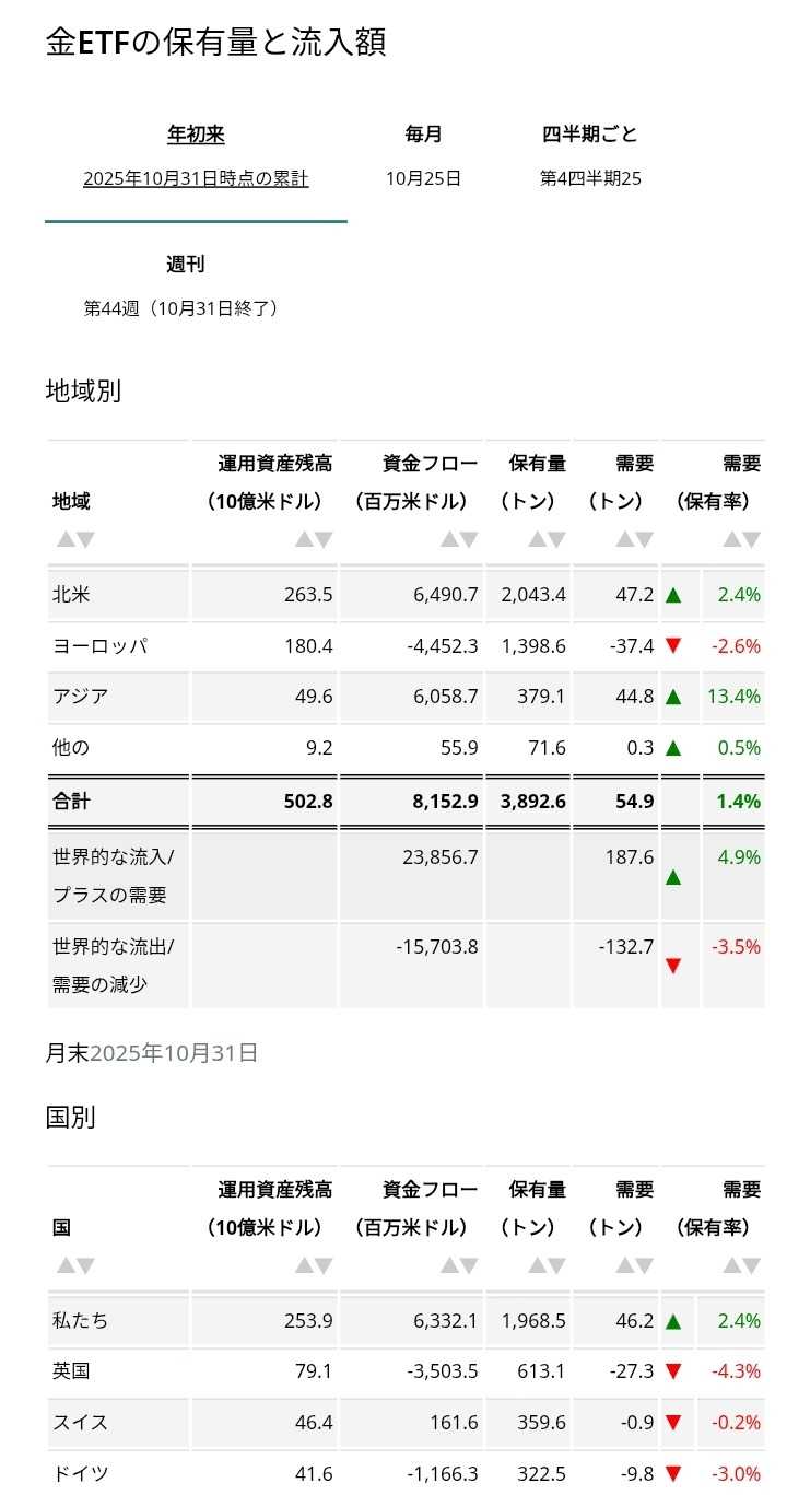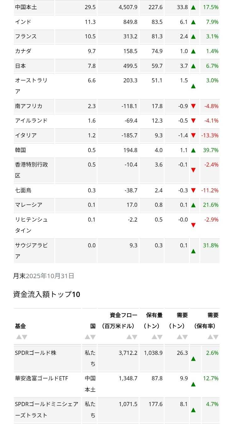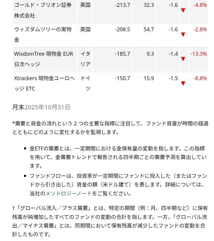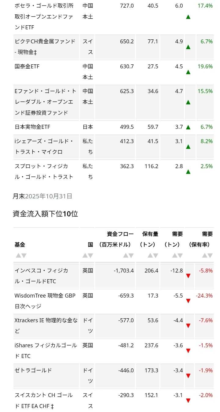 ⬇10月末の金ETFの保有量と流入額のリストです⬇