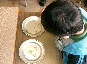 先日 小学校の 土曜学級 なるものに 参加。 1号(4年) にとっては 最後の そして2号(ちゅぱお 1年) にとっては 最初で 最後のまぁ 父兄参観日 みたいなものです。 1号のほうは ユニバーサル デザインを テーマにグループに 分かれて 調べたことを 発表して おりました。2号のほうは 地域の おじいちゃん おばあちゃんを 先生にむかしの あそび、 こま回しや あやとり けんだまなんかを 教えてもらって ました。そんななか こんなことも やってました。近頃の チビどもと来たら 箸の持ち方も ままなりませんからこんなゲームで 矯正 (強制?) してやろう ということでしょうか。 こままわし、 何十年ぶりかで 自分も やってみましたがひもの 握り方さえ 忘れてしまっていておじいちゃん先生に 教わる 始末でした~。 今日も レッツスピークI'm halfway done now.「いま 半分 できたよ。」 キャラスピ ???