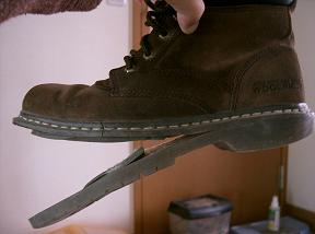 相も 変わらず 外回り。 すっかり 日も落ちた頃 パコンパコン と なにやら 鳴り響く。 おっと 危うく つまづきそうに なる。えっ! 足元を よ~く 見てみれば おい おい 歩けない じゃんかぁ・・・・。 しょうがないので たまたま 持っていたスーパーの 買い物袋 巻きつけてもちろん 外回り 続行 したのでした~。 はぁ~ 日が 沈んだあとで よかったぁ・・・・。 きょうも レッツスピークI can't put up with this anymore !「もう これ以上 我慢できない!」