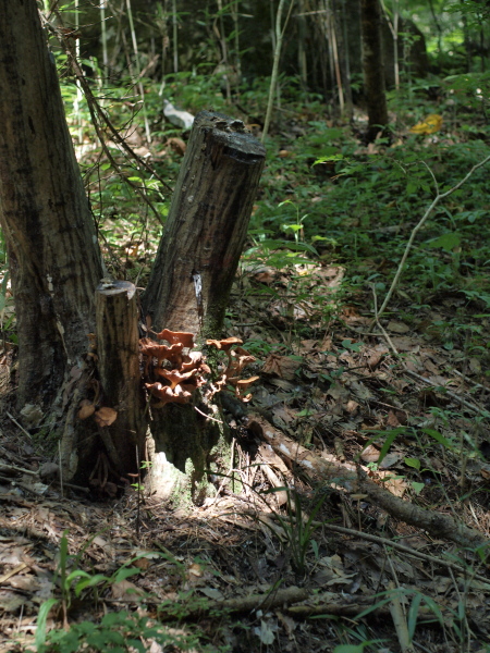 今日はお昼前から青葉の森に入りました。今回は、管理センターから出発して突き当たりの丁字路を左に折れてせせらぎ広場へ降り、引き返すコースでした。せせらぎ広場に降りる手前に枝を伐採した木があり、その幹にみごとなキノコが生えていました。名前はわかりませんが・・・一応、何枚か写真に撮ってからせせらぎ広場に降りましたが、陽が射さずかなり薄暗かったので、ほんの数枚、沢の景色(これはブレブレでほとんど使えるものが撮れなかった)と沢のほとりに咲いていたキバナアキギリの花を撮って、引き返しました。そのまま進んで疎林広場から管理センターに戻るルートも考えましたが、実はせせらぎ広場から先はかなりの急斜面を上らなければならず、そのあともアップダウンがあるコースなので、すんなりあきらめて引き返すことにしたのでした。そして先ほどのキノコのところに戻ってくると、行きとはちがって、ちょうどキノコのところだけにスポットライトのように日が当たっていました。これは撮るしかない!と撮った写真が今日の一枚です。がんばって先に進んでいればこの光景を眼にすることはありませんでした。また、せせらぎ広場に陽が射していて被写体がたくさんあったら、もう少し長居していたでしょうから、このスポットライトも別の場所を照らしていたことでしょう。いままで何十回とこの青葉の森を訪れていますが、こうして考えてみると一度として同じ光景はなく、いつも何か違うものを目にしながら歩いているのだなあ、と感じます。