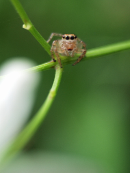 この日のお昼のお散歩は、またもやセンニンソウのポイントへ。あいかわらずきれいな花がたくさん咲いていました。まだまだつぼみもいっぱいあって、しばらく楽しめそうです。ヤブ蚊もまだまだ元気で、そちらは困ったものですが・・・今回は、OLYMPUS E-420はいつも通りでしたが、今回久しぶりにOLYMPUS OM ZUIKO AUTO-W 28mm F2.8レンズとOMエクステンションチューブ(7mmと14mmの2つ)を持っていきました。逆付けアダプターもつけていきましたが、実際には逆付け撮影はしませんでした。どんよりと薄暗い曇りの天気だったので露出がかなり厳しくなり、ほとんどのショットはF2.8開放で撮影することになりましたが、さすがはOM 28mm F2.8!かなりシャープな写りで大満足です。今回は、センニンソウの花の周りにたくさんクモたちがいたので、花というよりはクモさんを主役に撮影を進めました。たいていはハナグモが多かったのですが、唯一「ハエトリグモ」に出会いました。最初見つけたときは、茎の下を歩いていたのですが、カメラを向けて一枚シャッターを切ったとき、音に驚いたのかこちらを振り向きました。ハエトリグモ特有の大きくてつぶらな瞳がこちらを見つめます。何枚かシャッターを切り、レンズを近づけたり遠ざけたり・・・その様子をじっと見ていました。ときどき首をかしげたり乗り出したり、ひとつひとつのしぐさがとても愛らしく、いっぺんにファンになってしまいました。毒々しい模様やみっしり生えた毛などもなく、サイズも小さくてたいへんかわいいです。また機会があれば、レンズを向けてみようと思います。