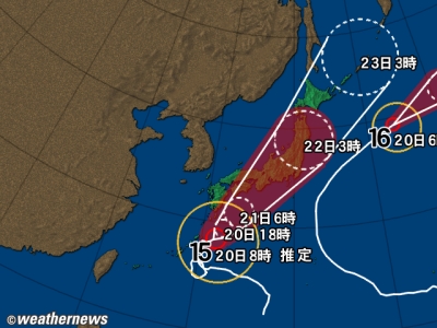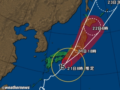 本日朝現在の台風15号の位置と予想進路です。この時点でも、まだ仙台直撃コースが予想されています。朝のラジオで、お天気キャスター・森田さんが「今回の台風は夏台風ではなく秋台風だから、偏西風に乗って予想通りまっすぐ行きますよ!」といっていました。結局その通りになったのですが・・・仙台への再接近は真夜中となりますが、午後からだんだん雨風が強まり、夕方には外に出たくなくなるほどの雨と風になりました。今日は車での出勤だったのですが、帰りに車に乗り込もうとしたら、ちょうど風向きが運転席の扉に吹き付けるかたちとなり、結局乗り込むときに車の中がびしょびしょに!街から南下して愛宕大橋の手前で河原町方面へ曲がったとたん、20~30センチほどの水。広瀬橋を渡って長町駅方面に向かう大通りでもところどころ大きく深い水たまりができており、皆さん車の両サイドに見事な水膜の放物線を形作っていました。