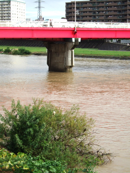 昨日の夜のうちに台風は仙台を通り過ぎました。最初の予想よりも東よりの進路を辿ったので、時速60キロほどの速いスピードで通り過ぎた台風進路の左側に入ったので、すこしは風もましだったのではないかと思います。朝起きると雨は止んでおり、家を出るときには日も射してきていました。自転車で台風のあとの広瀬川を見ながら出勤することに。やはり川は増水しており、サギさんたちは川の縁で魚を捕りに行けない川を恨めしそうに(?)見つめておりました。そして、宮沢橋の手前の木にたくさんのゴイサギさんたちが集まっていました。成鳥も幼鳥も取り混ぜて・・・何羽でしょう。けっこうたくさんいましたよ。下にはダックファミリーもずらっと一列に並んで座っていました(写真には入っていませんが)。朝すこし日も射した仙台でしたが、昼前には雨が降り出してしまって外に置いていた自転車はしっとり濡れてしまいました・・・
