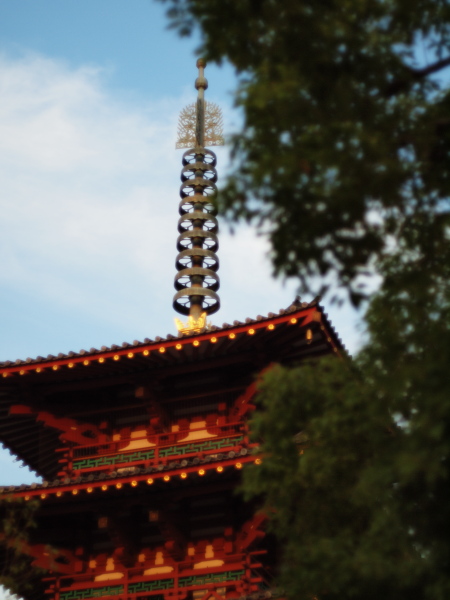 今週は月曜日から大阪へ出張です。宿は天王寺にある「スーパーホテル大阪・四天王寺」。天王寺駅から少々距離があるのですが、「【天然温泉】花乃井 秀吉ゆかりの天下取りの湯」ということばに、即決でした。今回は、楽天トラベルを通じて予約したのですがチェックインのときにはすかさず「スーパーホテル公式HPから予約すると、3回の利用で1000円引きに!」と宣伝されました。楽天トラベルなら3回利用しても約150ポイントのところが、というのがミソですね。そして、このホテルの立地はあの「四天王寺」に近い!なんと私、法隆寺には3回ほど行ったことがあるのですが、同じ聖徳太子ゆかりのこのお寺には今まで一度も行ったことがなかったのです。今回の出張ではけっこう荷物が多かったのですが、それでもカメラを持って行きました。それくらい気合いが入っていたのです。月曜は、到着が夜だったのですが、寝る前に一度下見に行きました。暗くて人もいなくて、ネコだけが歩いている・・・そして今日の用務終了後、いそいでお寺へ。もう夕方5時をまわっていましたが、1時間弱ほど境内をぐるぐる周りながら約80枚、シャッターを切りました。拝観時間もとうに終わっていますので、四天王寺式と言われる伽藍の中には入ることができませんでしたが、夕日を受けて輝く建物はやはりきれいでした。写真は、OLYMPUS E-620ボディにRICOH XR RIKENON 50mm F2をつけて絞り開放で撮ったものです。ピントは屋根を支える垂木の先につけられた金色の金具に。ばっちり合っているのですが、やはり収差のために光がにじんでいます。これを「味」とみるか単に「古いレンズの見苦しさ」とみるか・・・私は前者と考えたいです。庭園もあるのですが、こちらも残念ながら入れず。カメが大量に泳いだり甲羅干し(?)したりしている池(??)もあり、ゆっくり楽しめそうな感じでした。こんど時間があるときにもう一度来て、じっくり歩きたいです。