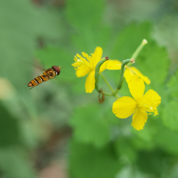OLYMPUS E-420ボディにOLYMPUS OM ZUIKO AUTO-W 28mm F2.8レンズ、そしてボディとレンズのあいだにOM EXTENSION TUBE 7mmをはさんで。E-420はファインダーの明るさ優先の設計なので、フォーカシングスクリーンがほとんどスカ抜けになっており、マニュアルでのピント合わせはとても難しいです。そこで、スプリットマイクロプリズムが真ん中にどーんと入っているスクリーンに換装し、ファインダー像を拡大する(つまり虫めがねみたいな)マグニアイピースをつけて、マニュアル専用機にしています。それでも、これだけ被写体(ここではヒラタアブ)が小さいと、ピント合わせはとてもとても大変です。でも、なんとかピントが来てくれました。ヒラタアブは、いきなり花に突っ込んではきません。ホバリングしながら着地点を探します。そのときは、脚をきれいにそろえて身体につけています。この姿がとても好きで、実は常々うまく撮りたいと思っていたのです。この写真はまだまだですが、修行を積んでバシバシ撮れるようになりたいです。