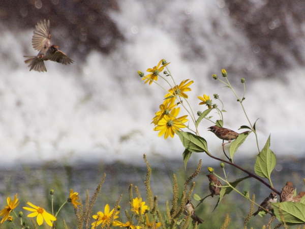 今朝の広瀬川では、カワセミさんとの出会いを密かに期待して、いままで赤や青の服を着て身を乗り出したために逃げられてしまった(と思っている)ので「濃紺」のシャツを着て行ったのですが・・・姿すらも見つけることができませんでした。広瀬橋上流側の堰で少しダイサギさんやササゴイさん、この堰より少し上流側の川岸でダックくんたち、そして大胆に削り取られてしまった中洲の上流にある、愛宕橋下の堰付近で黄色い野菊(名前はわかりませんが)を撮っていたら・・・スズメさんたちがわんさか飛んできて、一斉にか弱い野菊にどさどさと。ぐーんとたわんだ野菊に、左の方からさらにスズメさんが!「もうムリだからこっちへこないで!」「ええ?!そんなこと言わないでわたしも」なんてやりとりをしているようです。