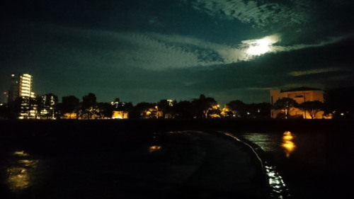 9月16日(金)今日は帰りがだいぶ遅くなってしまった。自転車で広瀬川の堤防を走ります。月が出ていました。川面を照らして、なかなかきれいな情景。写真撮ってみようかと思い立ち、いつもは朝通りがかりに写真を撮ったりする郡山堰の横で、川越しに西を向きます。by Sony Xperia Z5 Compact SO-02H湾曲している線が、堰です。落ちた川の水は月影に入って真っ暗に。そして肝心の月は・・・雲で光を和らげて、と思ったのですが、雲ごと白飛びしてしまいました。HDRで撮ればもうすこしイイ感じになったでしょうか。