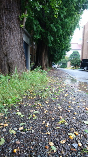 9月29日(木)昨日の日記では、かぐわしいキンモクセイの花を紹介しました。今日も、季節を感じる香りの話題。とはいっても、昨日のいいにおいとはちょっと趣がちがいます。by Sony Xperia Z5 Compact SO-02H地面に転がる黄色い玉ころ・・・そう、「ぎんなん」です。ここら一帯、イイ感じに発酵した(?)ぎんなんの香りで満ちています。ある意味、ニオイのテロです。写真で見ると、向こうへずっとイチョウ並木がつづいているようにみえますが、じつはイチョウの木は一番手前の1本だけで、あとはみなメタセコイアの木です。「ぎんなん爆弾」とか言われてちょっといやがられたりしますが、これも秋の風物詩といえるでしょう。