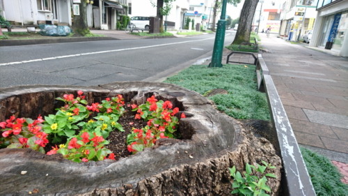 9月27日(火)今日の日記は3本立て。第2弾のこの記事では、東北大学片平キャンパス北門から北へ、一番町に向かう「道場小路」界隈の話題を採り上げます。この道場小路、北門を出て北へ、五ッ橋通りとの交差点まで(?)の短い通りですが、両脇に街路樹が並ぶちょっとしたいい雰囲気が楽しめます。そんな街路樹も何本か、老いて朽ちたか、伐採され切り株だけになったものもあります。そのうちのひとつ、切り株に粋な計らいが。by Sony Xperia Z5 Compact SO-02H土を入れ、花を植えてあります。なかなかです。午後の東京出張のため、仙台駅へ向かう途中の一息でした。