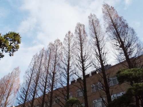 12月13日(火)昨日の朝に積もっていた雪は、日中あらかたとけてしまいました。今朝の東北大学片平キャンパス、北門を入ったところにあるメタセコイア並木は、すっかり葉を落として見るからに寒そうな姿になっています。by Sony Xperia Z5 Compact SO-02H今日は気温が低いわけではありませんでしたが、ちょっと風が強くて外を歩くと寒く感じました。