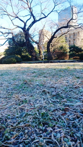 12月16日(金)最近、雪が降ったりしてずいぶん寒くなった仙台ですが、今朝はとくに寒かったです。東北大学片平キャンパス、学都記念公園の芝生を見たら、なんと!by Sony Xperia Z5 Compact SO-02H白い霜がびっしりでした。朝の最低気温は氷点下1.8度だったと後で知り、やっぱりね・・・と納得。