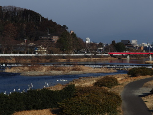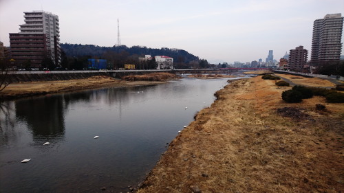 3月9日(木)今日も朝はいい天気でした。自転車で出勤です。ちょっと時間があったので、広瀬橋を渡って堤防をサーッと通り過ぎるのではなく、下の河川敷そして河原まで降りてみました。まずは広瀬橋の上から郡山堰、赤い宮沢橋、そして遠く泉ヶ岳方面を眺めてみます。by OLYMPUS STYLUS XZ-2郡山堰の下流、すこし流れが緩やかになったあたりに、たくさんハクチョウが泳いでいます。泉ヶ岳のあたりは雪雲に覆われているのか、山の稜線は霞んでまったく見えません。このハクチョウ集団を追い越してちょっと上流側の河原へ降りて行ってみると・・・by OLYMPUS STYLUS XZ-2あしもとにハトが飛んでくる、カモたちは水面にスライディング着水、そして向こうからハクチョウたちが泳いでやってくる・・・みんな「えさ」目当てです。いやいや、手ぶらです!なにも持ってません!どうぞご勘弁を。~~~天気はこのあと徐々に薄暗く曇ってきて・・・午後には雨もパラついたりと、どうにもよろしくないです。明日は回復するような予報ですが、はたしてどうなりますか。