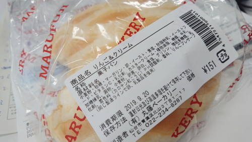 9月19日(木)暑かった夏がようやく一段落という感じです。仙台も、5月に観測史上初の2日連続30℃越え、とか9月になっても30℃越え連発、とか例年とは違う厳しい暑さでした。ようやくここ最近、激しい暑さが落ち着いてきました。広瀬川の堤防を歩いて出勤する途中で、ニラの花が咲いているのをみつけ、写真撮ったり・・・というような記事を別ブログに上げました。~~~さて・・・ランチの後、東北大学片平キャンパスにある売店「さくらショップ」に寄って、飲むヨーグルトとか野菜ジュースとか・・・そしてときどきおやつを買います。結構お気に入りなのは、北山三丁目にある「丸藤ベーカリー」の「りんご&クリームパン」。今日も買いました。by Sony Xperia XZ1 Compact SO-02K写真撮る前に一口かじってしまいましたが・・・このパン、名前の通りクリームパンなんですが、クリームの中に、ゴロゴロしたりんごが入っているのです。どんどん食べすすむと・・・こんなにたくさん!たいへんおいしいです。しかし!さくらショップで意外なお知らせが。それは・・・「9月いっぱいで丸藤のパンが入荷しなくなる」え?!「しかも、丸藤ベーカリーが会社をたたむらしい」ええ?!なんと、このりんご&クリームパンが食べられるのもあと2週間。しかも、来週は月曜日が祝日である上に4日間出張のため仙台を離れなければならない!もう、あと何日もない・・・まことに残念です。