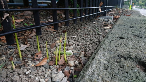 9月22日(日)日曜日のお昼、仙台市青葉区片平の片平丁通りを散歩していると、秋を感じさせるものが目に止まりました。by Sony Xperia XZ1 Compact SO-02Kニョキニョキッと出てきている緑の棒・・・それは彼岸花のつぼみです。棒の先の膨らみが少し割れて、中の赤いつぼみが覗いています。今年はお盆を過ぎ9月になっても日中は暑い日が多いですが、この彼岸花たちが開く姿を見れば、視感的にはグッと秋のムードになるでしょう。