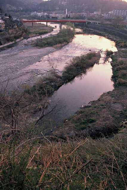 1月16日(木)この日記ブログに、2012年10月27日付で投稿した「一昔前の評定河原橋」という記事があります。なんと12年以上前の古い記事。そのコメント欄に、先週(1月7日)ひとつコメントが入っていたことを今日になってたまたま知りました。まさか自分の個人的な日記ブログの記事に外からコメントがくるなんて思ってもいなかったものですから、気づくのもずいぶん遅くなりました。さてそのコメント、書き込んでいただいた方はというと、宮城の橋に興味がおありの方のようで、現在の橋になる前の評定河原橋について知りたいことがあると、いくつか質問をいただいています。しかし、今の橋に架け替えられる前の評定河原橋については、たった一枚の写真と当時の淡い淡い記憶が残るのみ。ここであらためてその一枚の写真を披露いたします。なんとかこの写真から引き出せる情報はないかと、ネットで調べてみたり写真を穴が開くかというほど見回してみたりしました。・・・でも、やはり古い写真一枚だけでは限界があります。調べたりこの写真について考えたことをまとめて、ブログ「仙台市青葉区片平界隈情報」に記事をとうこうしましたので、興味のある方はそちらをご参照ください。もしかしたら、現場へ出向いて橋の周辺に、先代の評定河原橋のことがわかる痕跡が何か残っているかもしれない・・・ということで、今日は昼休みに、もう一度あらためて現場へ出向きました。それは、現在の橋と以前の橋がまったく同じ位置に架けられているわけではなく、わずかに下流側にずらした場所にあるからです。まずは片平丁通り、片平丁小学校の向かい側から広瀬川のたもとに降りて行く階段へ。by OLYMPUS STYLUS XZ-2「片平丁小学校前」バス停の横から階段を降ります。けっこうな高低差があります。「崖」といっても良いほどです。上から見下ろすと、広瀬川の横の道までは「ストーン!」と降りて行く階段が手前にあり、橋のたもとに通じる道は、昔から変わっていないようです。古いフィルムカメラで撮った写真、撮影した立ち位置がどこだったのか、という疑問がずっとあたまにあります。とはいっても、撮影機材が何だったのか、もうすっかり忘れ去っていますので、使用したレンズがどれなのかすらわかりません。でも、今日あらためて撮ったこの写真を見ると、この崖の上から撮影した可能性も考えられます。しかし、いちばん手前に写っている藪がけっこう近いので、階段の途中、または下まで降りてから撮った可能性も考えられます。階段を下まで降りていくことにしましょう。降り口には「→ 評定河原橋 瑞鳳殿(近道)」と案内されています。片平丁通りをもう少し下って行って、霊屋橋を渡って行くルートもあるのですが、歩けばこちらのほうが近道、ということです。階段を降り始めると、右には崖の垂直な壁、左には木が枝を広げて視界を遮ります。階段を少し降りた程度では、広瀬川や評定河原橋を見渡すことはできません。ほぼ階段を降りきったところで振り返って仰ぎ見ると、この片平の崖が相当高いことを実感します。堤防のところまで出て評定河原橋のほうを見てみると・・・これでは視点が低すぎますね。ということは、あの写真を撮ったのは階段の中間地点あたりの可能性が高くなります。左手に広瀬川、右側にはテニスコートと評定河原球場を見ながら橋に向かって歩いて行きます。この道、広瀬川の堤防(護岸?)は、評定河原橋が架け替えられる前からのものです。そして、橋に近づいたところで白い手すりに囲まれ上り坂になっている数十メートルの区間がありますが、これは新しい橋ができたとき、同時につくられたものと思われます。橋の高さまで数メートルの高低差があります。ここを登り切って、ちょっと見回してみます。評定河原橋は、片側(片平側)だけ、りっぱな歩道があります。橋の向こうには経ヶ峯の森。反対側を眺めると、これも新たに盛り上げてつくられたように見える坂道。ちょっとこの坂を降りてみます。脇へ入って行く道があります。奥にある花壇自動車学校へ入って行く道、路上教習の車が出入りしますが、評定河原橋を渡ってきてここを入って行くのはたいへんでしょう。ちょっと入って坂の下のほうを見てみます。なんだか不自然、こちらの道のほうがメインで、まっすぐ降りていくようになっていたのをむりやり断ち切って、右側につくった新しい道につなげた、という感じです。実際、縁石も古く、こちらの道は前からあったもので、新しい橋がかかったときそれにあわせて新しくつくった坂道はかつては存在しなかったものです。橋のほうを見てみると、新しい橋はかなり高い位置に架けられていることがわかります。かつての古い道路はほぼ水平で、広瀬川に突き当たったところで右に折れ、川に沿って花壇の奥のほうへ通じています。折れ曲がるカーブのあたりまで先へ進んでみます。左には現在の評定河原橋。やはりちょっと高いとこ