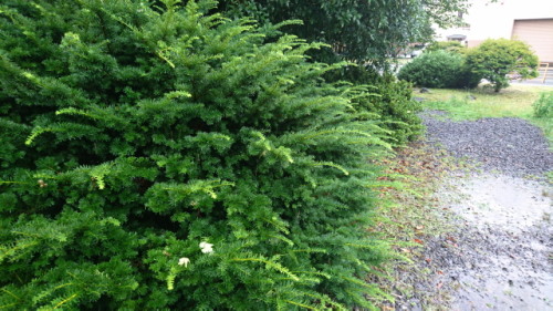 刈り取られたばかりの草地を横目に見ながら、正面の植え込みをさりげなくチェック。