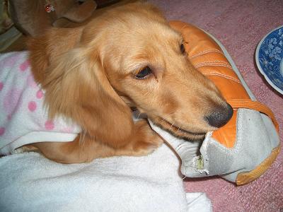 ←私が好きで履きこんでいたオレンジ色のシューズ。。ガ・ガ・ガ・ガーン、今朝早く我が家に連れてきてたんですが転寝していた間に、やられちゃいました。。。。もう仕方ないのでルネにプレゼントです。片方は無事ですが・・・よほど気に入ったんですね。。すこしずつ色んなことを覚えるルネ最近は「伏せ」を覚えました。。オークションの返事は相変わらずありません。一応yahooさんへ、どうしたらよいかをメールで相談中です。そんななか、新しいTシャツ見つけて昨日落札昨日のうちに連絡が付き、今日送ってもらっています。楽しみです。。。が、靴はお見事・・・・もう履けませんです(-_-)ハイ。。。。。。