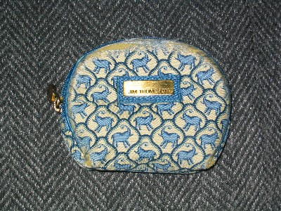 タイにジムトンプソンというブランド(?)があって、雑貨とか、ぬいぐるみ、スカーフ、ネクタイなんかが売ってます。私は過去二回タイに行ったことがあるんですが、その時に買ったコインケースを愛用してました。絹製で、像がわらわらとプリントされてて、大きさなんかもいい感じ。でも、三年間使ってたら、いろんなところの糸がほぐれ始めて、いつ穴があいて、ぽろぽろ小銭が落ちてもおかしくない状態になってしまいました。年季が入ってますね。 それで、ずっと新しいコインケースを探していました。でも、これと思うものがあっても、すごく値段が高いんですよね~。財布なんかでも思うんだけど、中に入れるものがなくなっちゃうほど高い。それに、やっぱり今使ってるのが愛着があって、同じのがほしいなー、と考えるようになりました。でもタイに行く予定ないし・・・。そのとき、日本でジムトンプソンの製品を扱ってるところがないかなー、と思い立ち、探してみると、ちゃんとあったんです。値段がチョイ高めなのが気になりましたが購入することに。ちなみに、タイで買えば600円です。通販で買ったのは1000円。でも、2つ買っちゃいました。なかなか可愛いと思いませんか?まずこっちをおろしました。白いのが像です。 黒いのはちょっとシックですね。 次にタイに行ったらまとめて20こぐらい買ってこようかな。