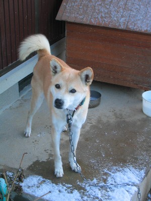 とうとう我が家も今年初冠雪です。雪が積もるのも珍しいのに、それが12月ってのは、今年はホントに寒いんですね~。朝一番にわんちゃんズを外に出してみました。どんな反応をするかなー、と。さらに今日はブログ初登場のトラちゃんです。本名はことら。名前の由来は犬が来た当時に劇はまりしてた某影虎さまから虎の字をいただきましたw次の写真はとらとレオンです。とらは気が優しいのでレオンが近寄っても怒りません。よっぽどのことをしたら(エサをとるとか)とらパンチが炸裂します。最後はトム君の写真。この子は外がよっぽど寒かったらしくがたがた震えてかたまってました。飛び跳ね回ってたレオンとは大違い。
