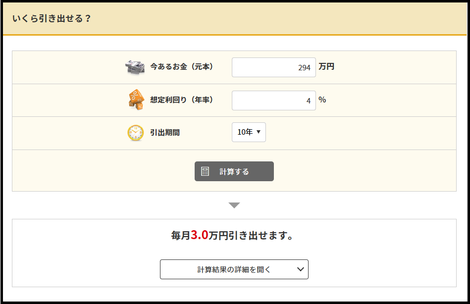 こん○○わ! 白たぬです。さて、次回の診察日までやることも無いので(笑)、【Step2】支出を減らす ~生命保険の解約を深堀します~のブログ記事で書いた様に、白たぬが民間の医療保険を解約して得た返戻金は約294万円。その保険料を投資信託で運用しながら、がん治療の医療費を支払った場合についてまとめたいと思います。がんは10年間再発しなかったら完治!なんだそうです。■では先ず元本の294万円を、年利4%で運用しながら10年間で使い切るには、毎月幾らまで医療費を支払えるのか見ていきます。結果はこちら。(みらい電卓シミュレーターより引用)答え:毎月3万円まで医療費を支払っても、10年は持ちます。実際に、2024年6月にかかった医療費は27,160円ですから、このペースだと10年は持ちそうですね。経済的な不安は軽減されたので、少し安心しました。とはいえ、今後は手術も控えているので、医療費はこれ以上に膨らむこともあるでしょう。■では次に、元本の294万円を年利4%で運用しながら、高額療養費制度を適用した上限額、毎月約8万円を支払ったと仮定した場合、何年で枯渇するのか見ていきましょう。結果はこちら。(みらい電卓シミュレーターより引用)答え:3年3カ月でなくなります。毎月手術でもしなければ、こんなに高額にはならないと思いますが参考まで。また、高額療養費制度については、世帯年収による上限額のほかにも、利用条件やお得な利用方法があるようで、次回のブログ記事でまとめて発信したいと思います。■現在までかかった費用年月金額概要など2024年5月5,380検査食、血液検査、問診など2024年6月27,160内視鏡検査、経過観察、紹介状作成合計32,540------