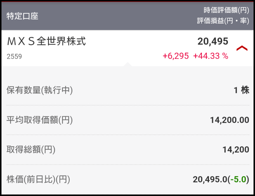 ◆ここまでの整理◆改めてAさんを振り返ります。95歳まで長生きするとして、60歳までに必要な資産は…・銀行口座(預金)から切り崩す場合は5,500万円(【Step3】)・運用を継続しながら切り崩す場合は2,979万円(【Step3】~再考版~ )必要と分かりました。当然、実現しやすいのは後者になります。Q:では、どうやって資産形成するか?A:答えは株式の投資信託です。Q:数ある株式の投資信託の銘柄で、何を選択すればよいか?A:答えは全世界株式で充分です。以降では、全世界株式・S&P500・全米株式それぞれの運用実績を基に、全世界株式で充分な証拠を見せたいと思います。2022年、自分が投資に目覚めた頃、数ある株式の投資信託のうち、何の銘柄に投資して良いか分からず、全世界株式、S&P500、全米株式それぞれに少額ずつ購入して、値動きを見ていました。その結果が以下です。1.全世界株式(楽天証券)全世界の主要3000社に投資できる銘柄に、つみたてNISAで2022年~2023年までの2年間、毎月33,333円積み立てた結果です。2年間積み立てて、その後半年ほったらかしの運用で41.94%の収益です。(この時点で全て解約すれば、評価損益にかかる税金(20.315%)が引かれずに、まるまる手元に戻ってくる。)2.S&P500(auカブコム証券)アメリカの主要な500社に投資できるこの銘柄に、2023年1月~2023年12月まで1年間、同様に定額を積み立てた結果です。(ここからは金額伏せます)1年間積み立てて、その後半年ほったらかしの運用で42.1%の収益です。3.全米株式(楽天証券:楽天VTI)アメリカの株式市場の投資可能銘柄、約4,000社に投資できるこの銘柄にも、2022年9月~2023年5月までの9カ月間、同様に定額を積み立てた結果です。9か月間積み立てて、その後約1年間ほったらかしの運用でも52.79%の収益です。4.全米株式(SBI証券:SBI・V・全米株式)アメリカの株式市場の投資可能銘柄、約4,000社に投資できるこの銘柄にも、2023年1月~2023年12月までの1年間、同様に定額を積み立てた結果です。(SBI証券でも全米株式を扱っていて、信託報酬が楽天証券より低いため、楽天証券では積み立てを停止して、SBI証券で積み立てを開始しました。)1年間積み立てて、その後半年ほったらかしの運用で約39.37%の収益です。ここまで、とても運用成績が良いものでした。一般的に年間の平均利回りは、S&P500は10%全米株式は8%全世界株式は7%と言われています。なお2022年のS&P500はマイナス 18.11%のマイナス成長でしたが、2023年は26.44%と回復したそうです。~ちょっと脱線~このような、評価額の振れ幅のことを投資では「リスク」と呼ぶそうです。ハイリスク・ハイリターンとは、価格の上下変動が大きい分、上がった時の利益が大きいことを差すのですね。反対にローリスク・ローリターンとは、預金や債券の様に、価格の上下変動が小さい分、利益も小さいことを差します。リスクがあるから、そのリスクに応じたリターンがあります。つまり、ローリスク・ハイリターンはあり得ないことになります。~脱線終わり~【Step3】では利回り7%として試算していましたが、【Step3】~再考版~ では利回り5%として試算しました。5%の理由は、毎年の物価上昇率を2%と仮定して、全世界株式で運用した場合、平均利回り7%から物価上昇率2%を引くと利回りが5%となるからです。将来の資産を形成するのに、時間を味方につければ利回り5%でも充分であれば、あえて7%、10%の銘柄を選ばなくても良いと思います。だから、答えは全世界株式で充分です。皆さんの投資の第一歩の助力となりましたら、嬉しいです。